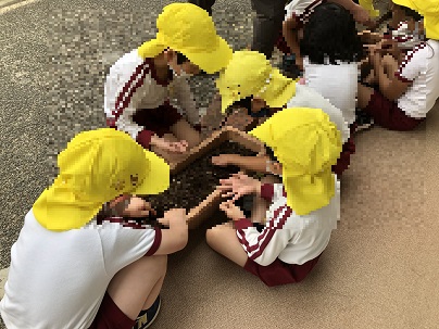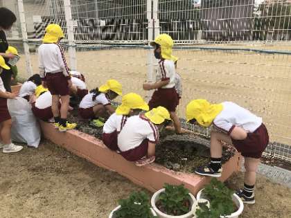 今日もみんなで栽培活動。プランターにヒマワリや風船かづら、ゴーヤなどの種を蒔きました。どんな芽が出てくるのか、楽しみですね。また、花壇も次の花を植える準備をしました。そこで見つけたのはバッタの赤ちゃん(^^)優しくつかんでいたのが印象的でした。