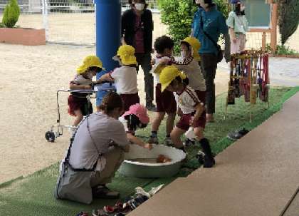 今日で保育参加が終わりました。参加された保護者から、「一人一人がとても楽しそうでした」「泥遊び、水遊び、裸足など感触を味わっているのがよかった」「活動の様子をホームページで見ていますが、実際に一緒に遊んだことで、より分かりました」「次回はいつなのかな・・と今から楽しみです」など好評的な感想をいただきました(^^)