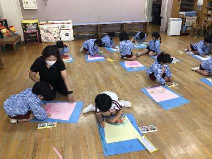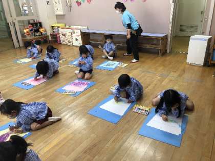 今、色水遊びを楽しんでいるので、コップの形に切った画用紙を用意し、パスでジュースをつくりました。一つの味(色)のジュースやいろいろな味(色)を混ぜたジュースが!最後はストローを差して、出来上がり!どれも美味しそう(^^)この時期、パスをしっかり持つ、紙面上に大きく動かす経験が、後の絵の具遊びに繋がります。