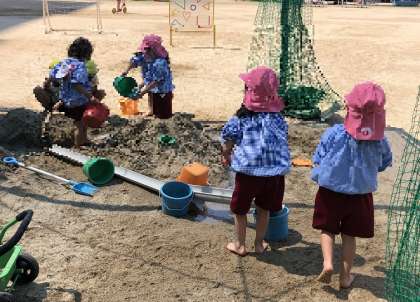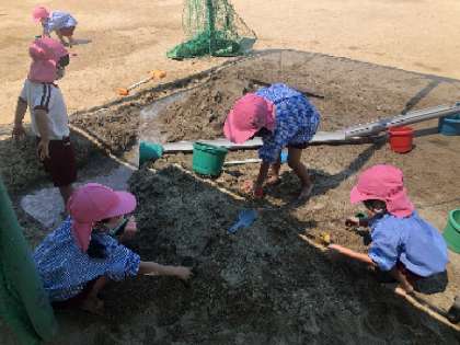 お城と温泉つくってるねん(4歳児) 公開日 2022/05/24 更新日 2022/05/24 園児の様子 今、感触を味わる遊びが園庭で繰り広げています。昨日、クラス全員でアトリエ着に着替え、裸足になって砂場へ・・山をつくったり、穴を掘ったり、そこに水を流したりして存分に遊んでいました。今日、またしたいと思った子どもたちが、裸足になり、何度もバケツなどで水をくんで流したり、砂を固めようとしたり、宝物(カップなど)を埋めたり・・それぞれに「〇〇したい」気持ちで遊んでいました(^^) いいね(0)