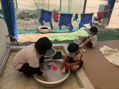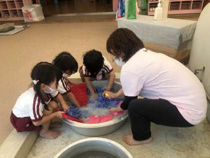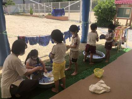 ジャブジャブ ゴシゴシ お洗濯 公開日 2022/06/02 更新日 2022/06/02 園児の様子 今日は感触を味わって遊ぶ絶好な天気でした。存分に楽しんだ後、汚れたカラー帽子やアトリエ着を自分たちでジャブジャブ!「擦る」「絞る」も大事な経験ですね。洗った後、もちろん干しました(^^) いいね(0)