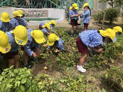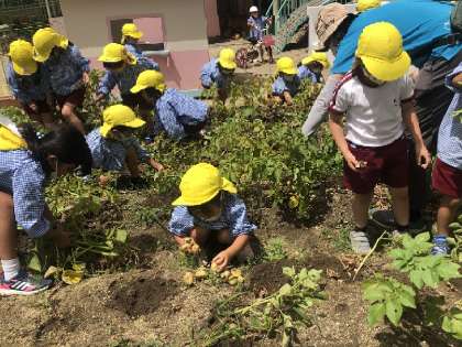 昨年度の経験もあってか、意欲的に土の中のジャガイモを掘っていました。大きいのも小さいのも掘って出てくると大喜び!4歳児から「どれだけとれたか教えてね」と頼まれて・・さぁ、明日みんなで数えよう!どこで数える?どのようにして数える?みんなで考えるようですよ(^^)