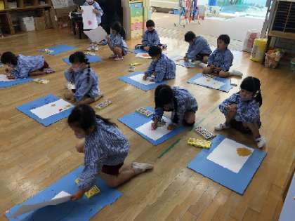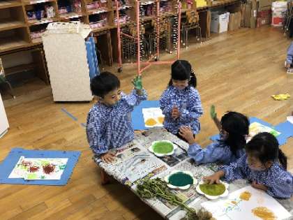 収穫したジャガイモのことを思い出しながらパスを使って思い思いにかいていきました、そして、手で(絵の具)葉や茎をかくと・・自分たちで掘ったジャガイモだけに、思いがふくらんでいったようです。また、5歳児に何個ジャガイモを収穫できたのか聞いたのを覚えていたのか、気になって、2階プレイルームにのぞきにいく子どももいました(^^)何個あったのかな・・楽しみですね❤