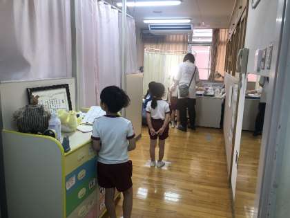 最後の健康診断は歯科健診でした。特に5歳児は6歳臼歯がはえてきたり、乳歯が抜けたりする大切な時期です。みがき残しのないようお家の方の仕上げみがきの協力や食事ではよく噛んで顎を動かすことが大切です。結果をまたけんこうてちょうでお知らせします。しばらくお待ちください。