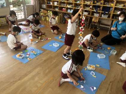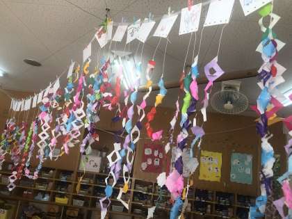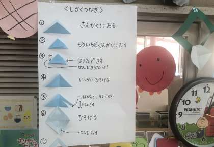 先日貝殻つなぎに挑戦していた5歳児。今日は四角つなぎです。真剣な眼差しで、ハサミの先で調整しながら切り込みを入れてつくっていました。あれ?どこを切り込めば・・と困ったとき、自分で確かめながらつくれるように、前につくる手順を分かりやすく掲示しているので安心ですね。出来上がった飾りが時折吹く風に気持ちよくなびいていました。