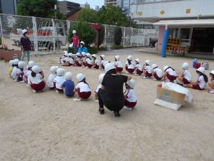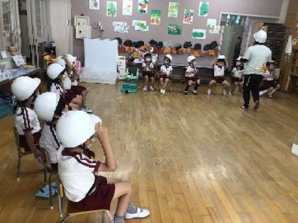 今日は地震が起きた時、どうすればよいかを事前にクラスで話し合いをした後に避難をしました。地震はいつ起きるのか分かりません。「大切な命を守る」「大事な頭を守る」ということで、ヘルメットの着用を初めて試みました。「お・は・し・も」の約束、守れていました。