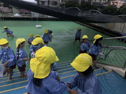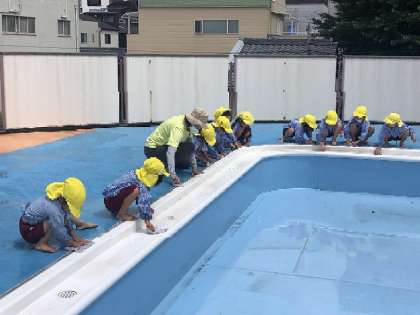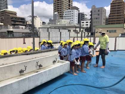 いよいよ明日から屋上で水着を着て、ウォーターパークが始まります。その前に5歳児が雑巾で拭き掃除。「あっ!ここ汚れている」「掃除しとかな」とても張り切って最後まで頑張っていました。楽しみだぁ〜