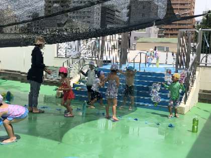 樋を使っての遊びのコーナーではいくつもボールを並べ、ジョウロでどこに水を流せばうまく転がるかを考えていました。また、水鉄砲の水に当たらないよう透明シートをつけたフープを盾にして遊んでいました。