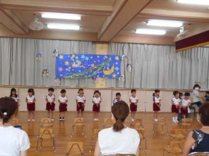 4歳児が9時15分、5歳児は11時から第一学期の終業式を行いました。36日間の夏休み。おうちのひとと約束を決めてできたら海のいきものに色をぬることができるやくそくカレンダー、歯みがきをしたら、一日1匹の虫歯菌を退治することができるはみがきカレンダーの話をしました。さぁ、できるかな・・楽しみながら挑戦してくださいね。