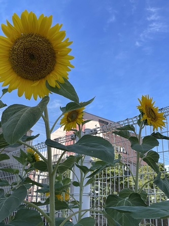 園庭に咲くヒマワリ。少しお辞儀をしたヒマワリをよーく見て見ると、ヒマワリの種の殻がたくさんのっていました。