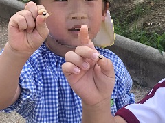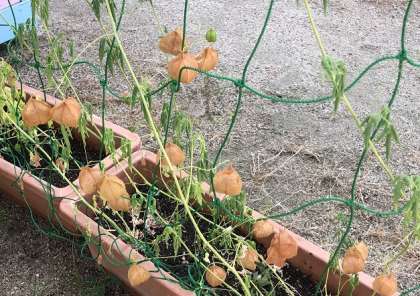 一時預かり事業(ハッピーらんど)に来ている子どもたちが、風船カズラの茶色くなった袋状の果実から、白いハート模様が入った可愛い種を取り出しています。