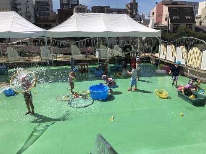 晴れ渡る青空の下、4歳児はウォーターパーク、5歳児はプール遊びを楽しみました。