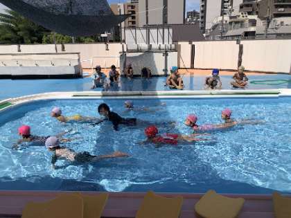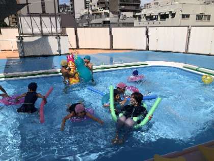 来年、5歳児は小学校の広いプールで、4歳児はまた、この2階テラスとプールで、水と親しみながら、面白さを(時には怖さ、命の大切さも)体験しましょうね(^^)