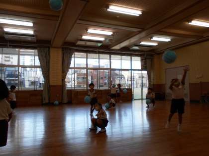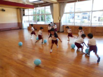 柔らかいので当たっても痛くなく、扱いやすいボールなので、子どもたちが思い思いに、思い切り転がしたり、蹴ったり、投げたり・・その姿を見て先生はいろいろ考えている子どもをみんなに知らせます。それを見て、「自分もやってみよう」と心が動いたのでしょう。次々と挑戦して楽しんでいました。