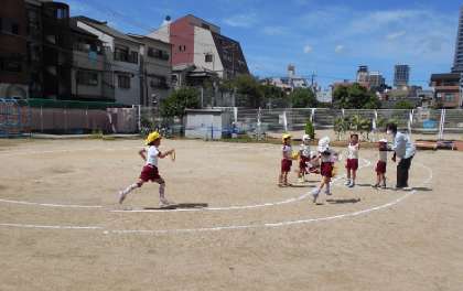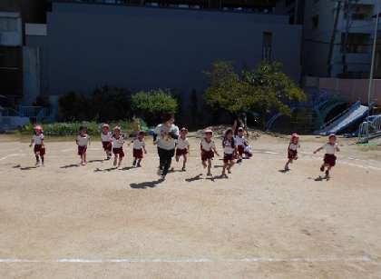 一方、5歳児の遊びを見て、4歳児も刺激を受けたのか、先生と一緒に直線走りのかけっこ!