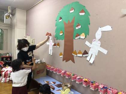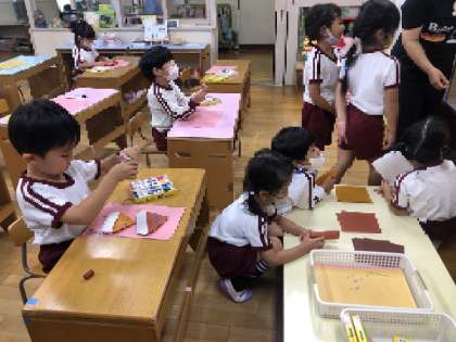 大きな栗の木の下で (4歳児) 公開日 2022/10/07 更新日 2022/10/07 園児の様子 朝、保育室から可愛い歌声が聞こえてきます♪ ♪おおきなくりの きのしたで〜♬ 今日チラッと保育室をのぞくと・・ まぁ かわいい栗を折り紙でつくっていました。 半分に折る 角を合わせる 折り目をつける など 指先を使う動作も この時期になると うまくなってきていますね。 出来た栗は早速栗の木に(^^) これから、今まで聞こえてきた歌声が、より可愛く楽しそうに聞こえてきそうです。 いいね(0)