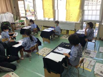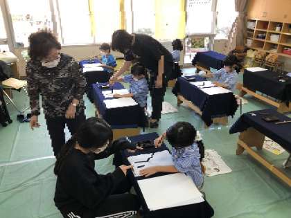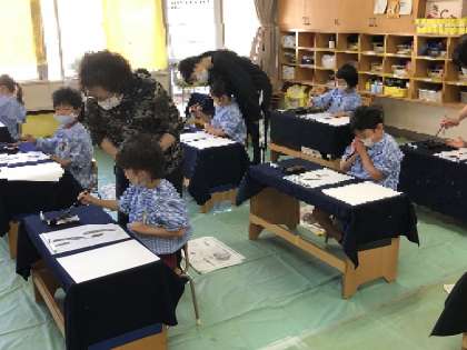 朝、こどもたちがいつもと違う雰囲気の保育室を見て「学校みたいや」「勉強するみたい」と思い思いに話していました。また、硯や文鎮を見て、「これ、お兄ちゃんが持っている」とも・・