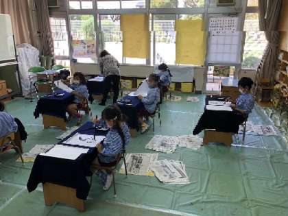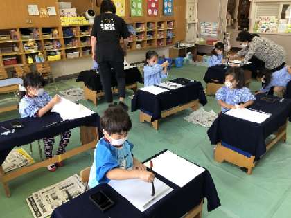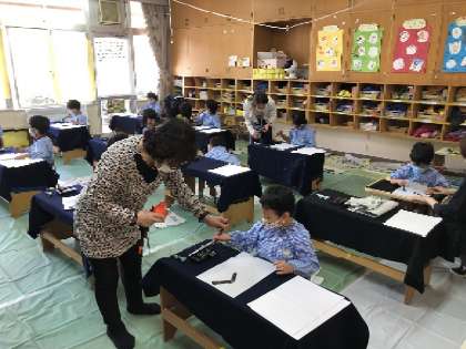 2日目なので、子どもたちも心得ていて、何枚も何枚も書いているうちに、「止める」「はらう」といった、筆の使い方も分かってきているようです。