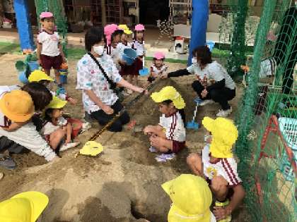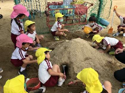 今日は砂場が大盛り上がり。4歳児5歳児が入り交ざって遊んでいました。コツコツつくっていた城に「トンネルつくろ」となり、四方から掘り始めました。途中からお玉もつかって崩れないように、力を加減しながら掘り続けていました。