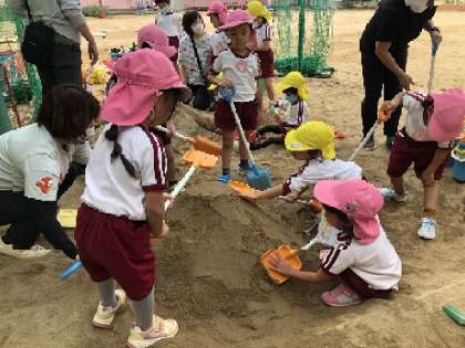 その城の隣に「第2弾!」といって城をつくり始める4歳児。土の硬め方を5歳児が何気に見本を見せていたり、4歳児同士でも「そこはもっと」と協力し合っていたりする姿が。