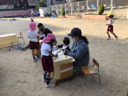 未就園児の子どもたちも大分慣れてきたようで、園内の自然に触れたり、在園児の遊びを真似たりして楽しんでいます。今日と次回の園庭開放時に「おえかきコーナー」を設置しました。かいた作品を12月4日の作品展でも展示しようかと考えています。
