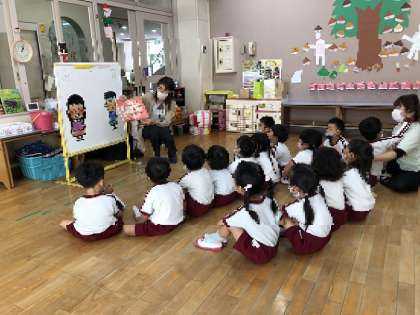 絵本「おなかのこびと」の一部の話をし、パネルシアターを使って、夜はスマホなどを見て遅くならずに寝る。朝はしっかりごはんをとる。おやつは少しにする。ことを話してくれました。そして、降園前に養護教諭から、再度、絵本の読み聞かせをしました。