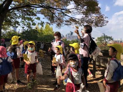 今日はドングリ拾いや色づいた葉や子どもたちの顔の大きさくらいの葉みつけを十分に楽しみました。途中風が吹き、葉っぱのシャワーを浴びて、歓声が・・
