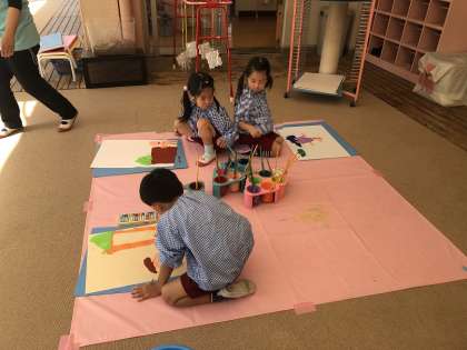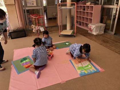 鮮やかな配色を使って、先日でかけた大阪城公園のときの絵をかいていました。「どんなときのことをかくの?」「〇〇ちゃんとおにぎりを食べたところ」「大きいくみさんに、オーイって手を振ったところ」など・・