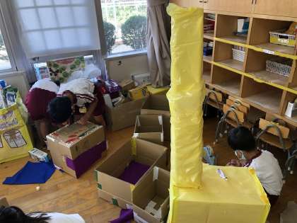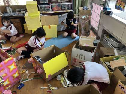 何もついていなかった段ボールが、いろいろな形に穴があいていたり、お家からもってきたたくさんの素材から使いたいものを選んで内側や外側につけたり・・