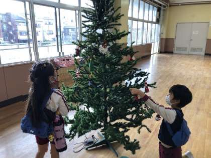 昼食後、2階プレイルームで木に飾りをつけていきました。