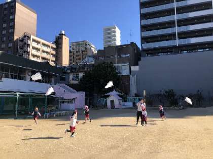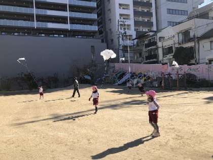 広い園庭で たこあげ (4歳児) 公開日 2022/12/19 更新日 2022/12/19 園児の様子 園庭に日が差すまで待って、2グループに分かれてたこあげをしました。 子どもたちは凧をもって走ることが楽しかったようです(^^) 広い園庭なので、存分に走ってあげていました。 凧あげの後、暖かい保育室で、手回しこまをしていました。 明日もたこあげしようね。 実は・・ 4歳児が凧をあげているとき、緑色の封筒が屋上についているのを見つけ、5歳児に知らせに行きました。 いいね(0)