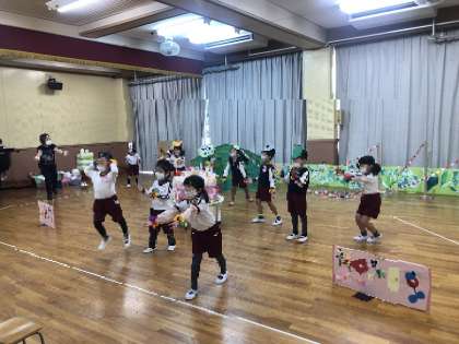 みんなでパーテイー 〇〇生まれ〜ハーイ! (4歳児) 公開日 2023/02/02 更新日 2023/02/02 園児の様子 当日、登場する役も決まり、マイお面をつけて遊んでいます。 1年間、パーティごっこをして遊んでいるもも組。 保育室でもみどりのみどりの家(大道具)の中で美味しい料理をつくっています。 これは劇中でのパーティの場面。 とてもいきいきしていますね(^^ いいね(0)