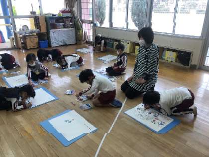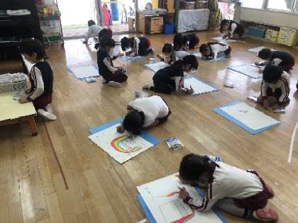 今日は5歳児が修了進級記念アルバムの表紙をかいていました。