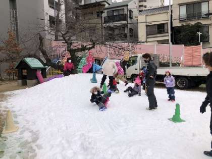 雪だるまをつくろうとしたり、築山からそりなしで滑ったり・