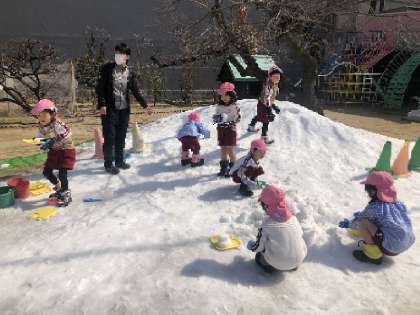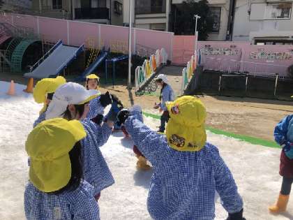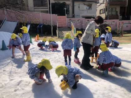 氷になってる! 公開日 2023/02/17 更新日 2023/02/17 園児の様子 築山付近の雪が寒さで凍っていました。 陽が照る昼ごろから遊びました。 みんな、昨日の雪の状態とは違うことに気が付いていました。 「ほら、氷でしょ。きれい」「美味しいケーキの出来上がり!」 中には雪を桜の木の上にのせている子どもたちもいました。 2日間、雪や氷の感触を楽しめて、大満足! いいね(0)
