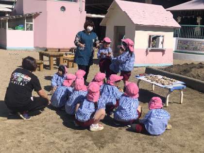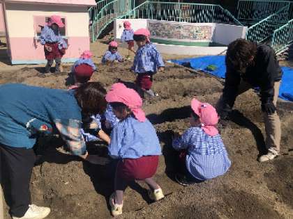 担任があらかじめ畝に植えやすいように穴をあけていたので、スムーズに植えることができました。今年度は865個収穫できました。来年度はいくつ収穫することができるのでしょうね。楽しみです。