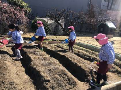 「どっちを上にして植えたらいい?」の問いかけに、みんな「えっと、こっちかな」「どっちかな」と真剣に考えていました。
