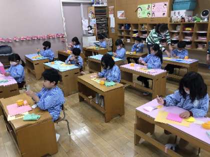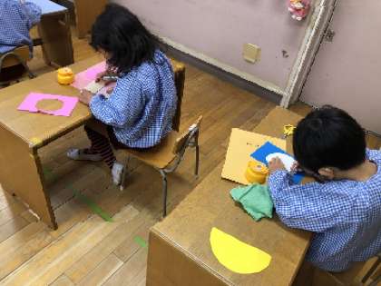 今日は線の上を切っていく方法で、丸をつくっていました。その線は自分で円の型を画用紙の上に置き、押さえながら鉛筆で書いていました。型を押さえながら書くことができるようになったんですね。ビックリしました。これも日々の積み重ねですね。保育参加のお母さん先生も大活躍でした。