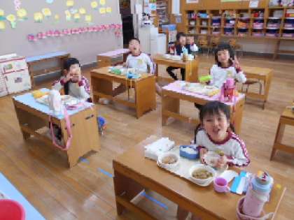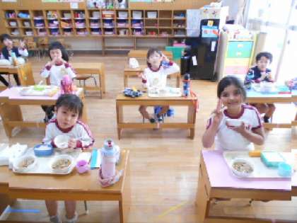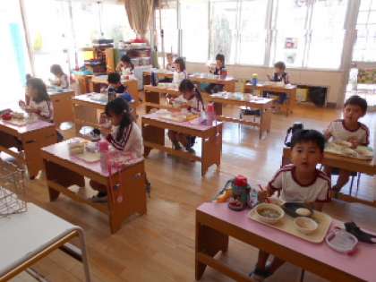 いつも2階のプレイルームで食べていましたが、1階の4歳児と5歳児の保育室でいただきました。