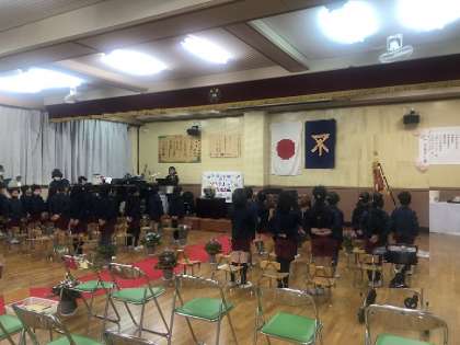 会場の毛氈のそばに花が飾られ、保護者席も並べられて、会場が整ってきました。