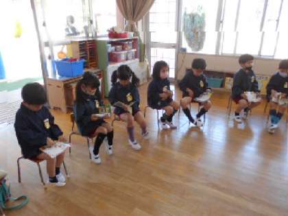 5歳児の保育室にそ〜っと様子を伺いながら入ったり、新しいロッカーやコップかけについている自分の名前を見つけて喜んだり・・新しいおたよりちょうも見入っていました。