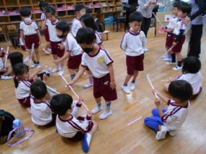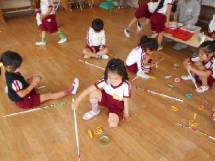 5歳児が真剣なまなざしで厚紙を長細〜く巻いていました。