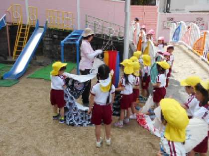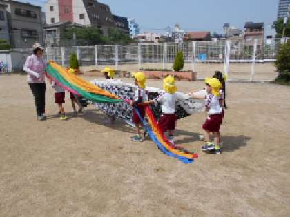 園庭で好きな遊びのあと、5歳児がみんなで吹き流しや大きいまごい、ひごいをポールまでもってきて・・