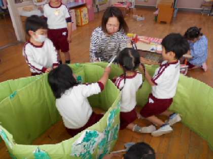 今、園庭でダンゴムシ探しが盛んなことから、画用紙をつかってダンゴムシつくりをしていました。