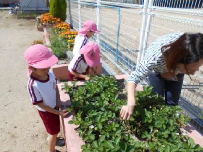 保育室で♪ちっちゃないちご♪の歌を歌っていて、歌詞の通り、園庭の花壇で育っているイチゴの苗にカワイイ白い花や実がなっています。