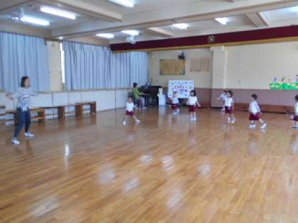 また、広いプレイルームでは先生と一緒にピアノの音に合わせて体を動かしています。
