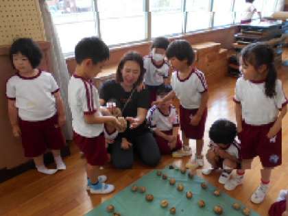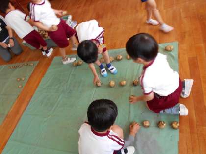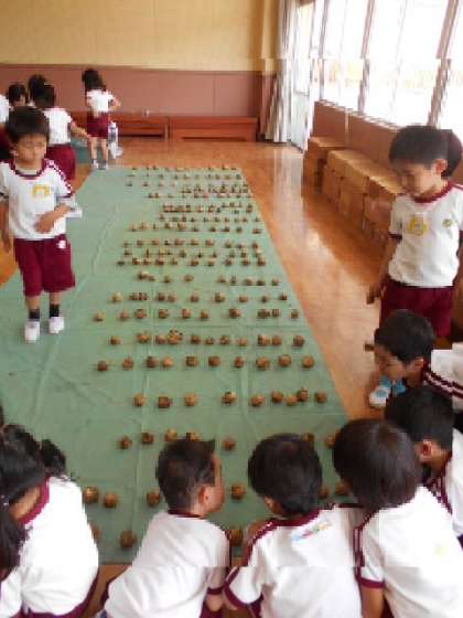いくつかをとって自分なりに大きさを分けてから並べる子、ひとつずつ手に取って「これは大きいからこっち」と確かめながら並べる子、それぞれのやり方で並べていきました。並べ終わってちゃんと10個ずつあるかを確かめている子もいました。