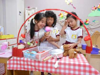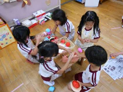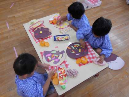 4歳児が先日から画用紙に絵の具をぬり、一回切りした色紙をフルーツに見立てて貼っていて・・今日、そこに5歳児も加わって、あっという間にクレープ屋さん〜