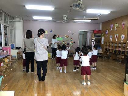 園庭遊びで砂場や鬼ごっこなど、室内遊びでは手遊びたダンスなど、一緒に過ごしていました。