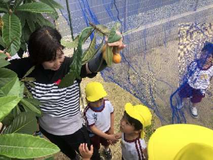 保育参加時に4歳児がビワの実を収穫し、5歳児に「美味しそうやよ」「沢山とれたよ」と報告。それを聞いた5歳児も急いでビワの木へー